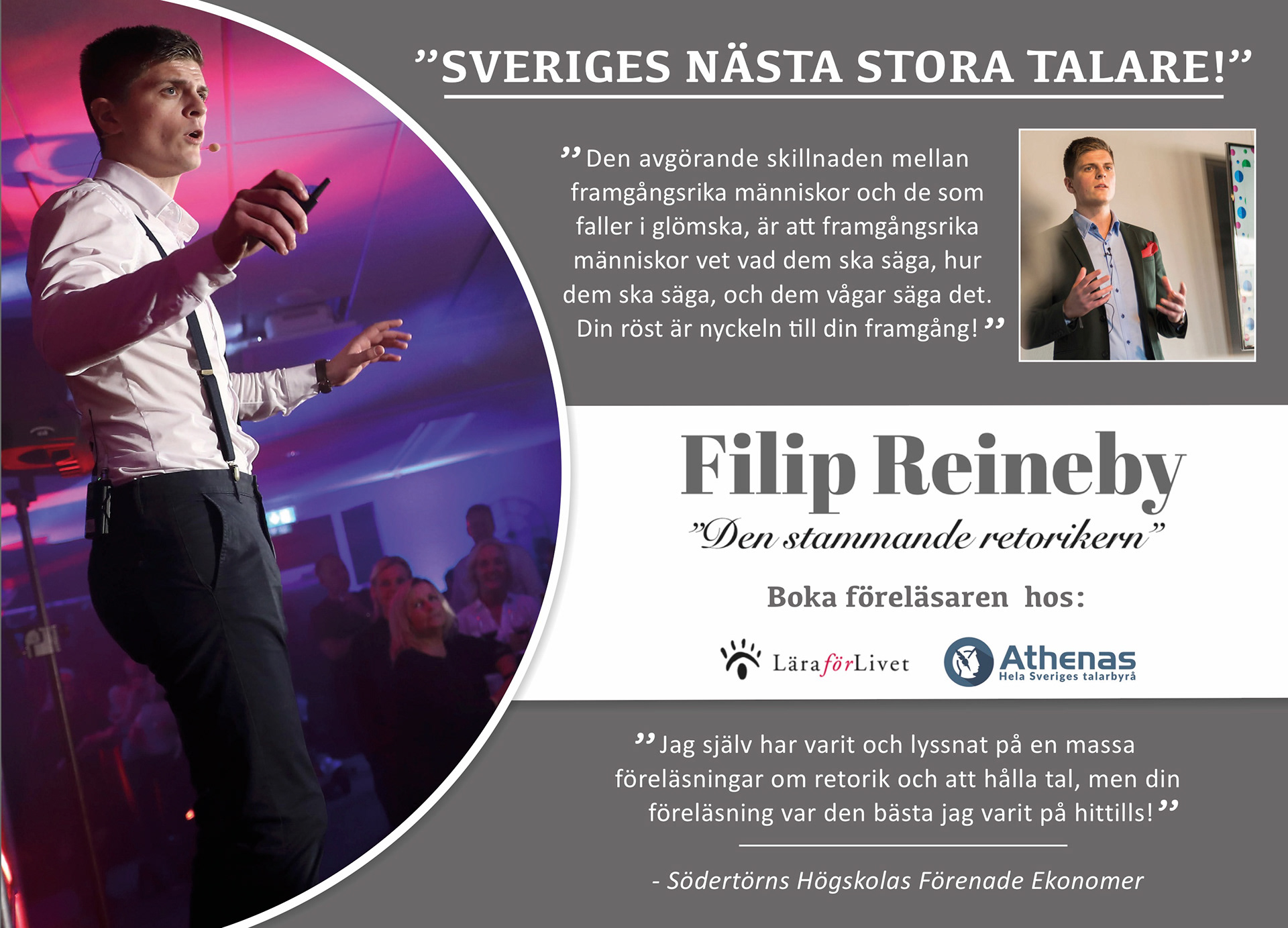 En annons som jag skapat själv för Metro som var kunden. Annonsen är en halvsida i Metros dagstidning. Bilder och text fick jag skickat till mig och layouten har jag gjort. Annonsens målgrupp är företag som gillar intressanta föreläsningar där man går ifrån och lärt sig en massa och utbilda sin personal, i detta fall retorik och tal.